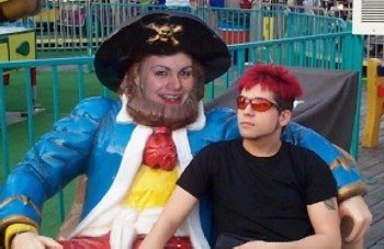 But, before that I was craving a snow cone, and if you are a fan of X-E you know what I am talking about, but I was being haunted even there. It seemed everwhere I looked I saw asphodelli's face. There I am eating a nice lime snow cone, trying my hardest not to drop too much on my shirt, I turn and look and there on top of Gay Pirate Dan's shoulders is none other than...........................