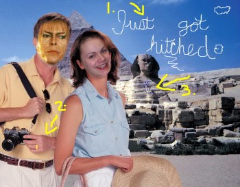 I went to egypt, becuase I always wanted to go there. I mean it's not every day you get to see giant sand triangles and hey maybe I would find something interesting. And I did. As yo can see from the picture above I found them. And with my keen eye I was able to disern that something had happened between David Bowie and asphodelli. The first clue was the sky writing, so I assume that someone got married. The second clue is the wedding ring in which David Bowie is flashing on his finger. The third is another piece of grafettie, but this time it's on a sphnix. It had the same jumbled clue on it as did the boxing glove and the windmill. I now knew why asphodelli was hiding frrom me the whole time.